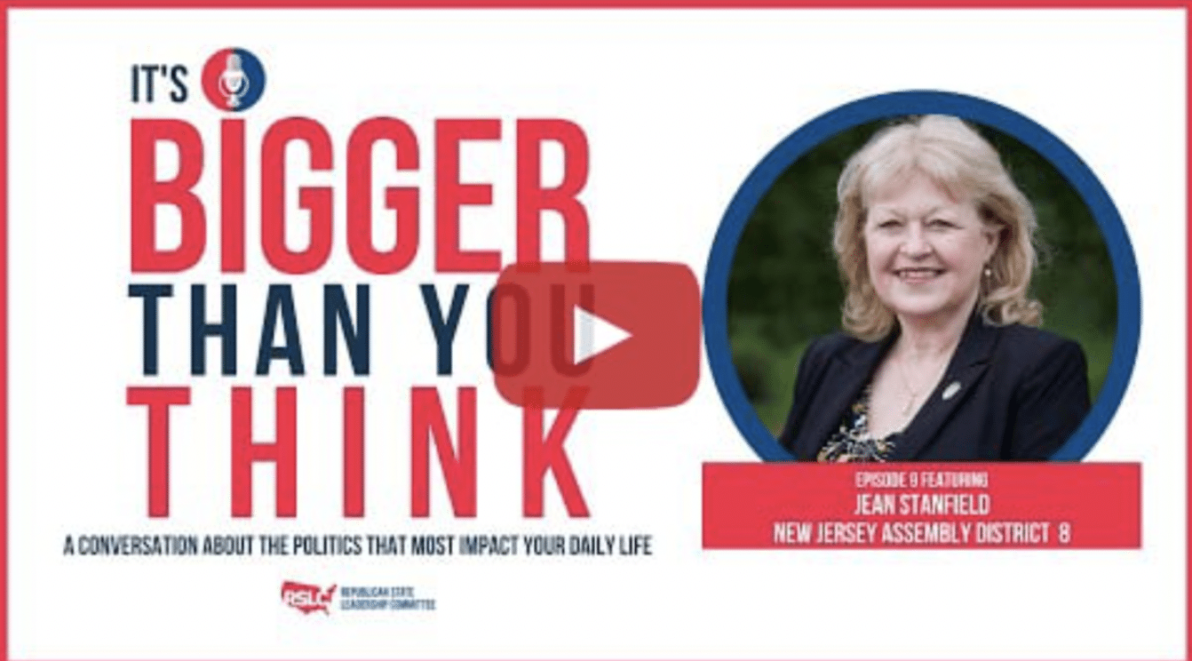 Washington, DC — The Republican State Leadership Committee today released a new episode in its podcast series “It’s Bigger Than You Think,” featuring an interview with New Jersey Assemblywoman and 8th District Senate candidate Jean Stanfield. Stanfield was the first female sheriff of Burlington County, serving her community for 18 years. She has also served as assistant prosecutor in Burlington County. During the episode, Stanfield addresses New Jersey’s lack of affordability, how to make New Jersey more of an economic hub, how her experience as a sheriff for nearly two decades has given her a unique perspective on rising crime in Democrat cities, and the negative effects of the defund the police movement.