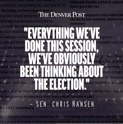 Washington D.C.— Following the conclusion of the state legislative session in Colorado last week, the Republican State Leadership Committee (RSLC) released a new video today exposing legislative Democrats on their election year makeover. The video comes just weeks after Democrat Senator Chris Hansen’s stunning admission to the Denver Post that the agenda Democrats in Denver have pursued this year has been for the sole purpose of saving their seats in a “tough cycle for Democrats.” The new video from the RSLC notes how the policies Democrats have advanced in 2022 are a weak attempt to paper over their record of raising the gas tax, increasing health insurance costs, and weakening law enforcement.