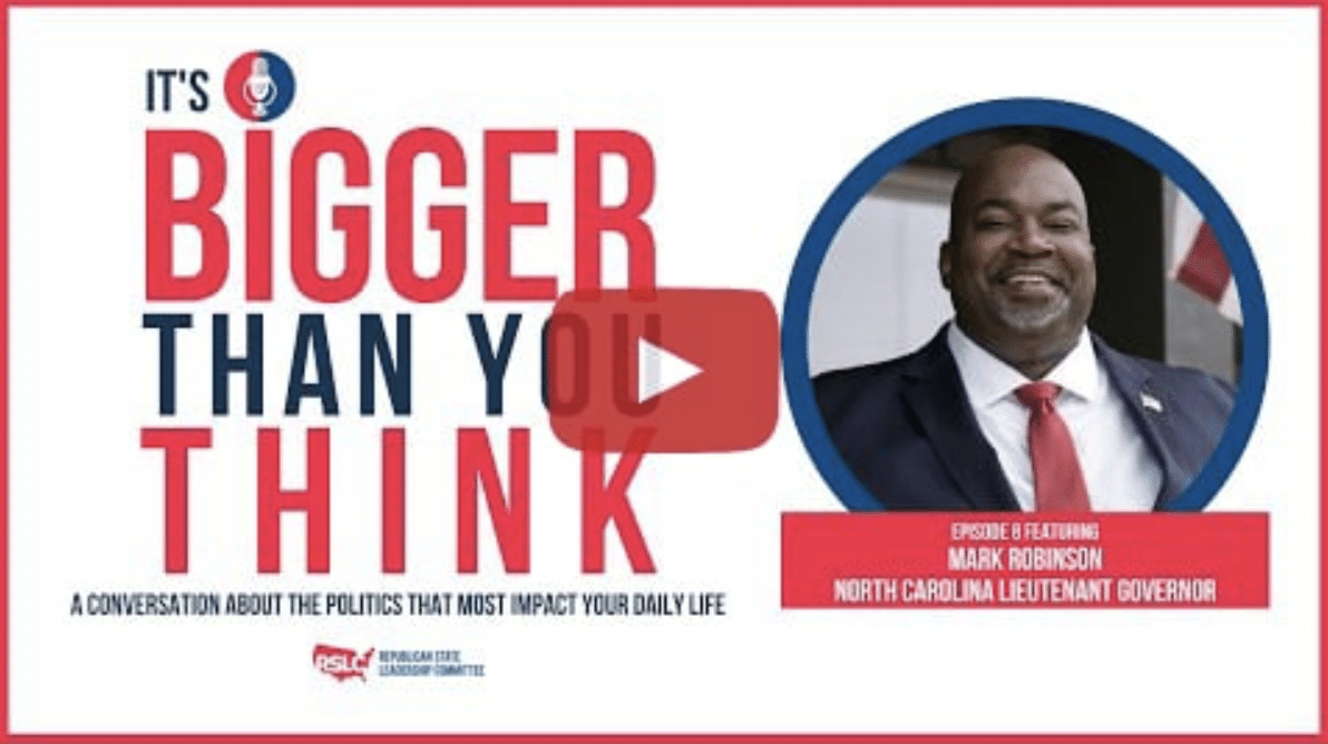 Washington, DC — The Republican State Leadership Committee today released a new episode in its podcast series “It’s Bigger Than You Think,” featuring an interview with North Carolina Lieutenant Governor Mark Robinson. Robinson, a political outsider who has not previously held office, rose to prominence in the Tar Heel state after a passionate speech he gave in defense of the Second Amendment in April of 2018 to the Greensboro City Council went viral. The RSLC in 2020 helped Robinson beat back over $8 million spent against him by Michael Bloomberg so he could become the first African American lieutenant governor in North Carolina’s history.